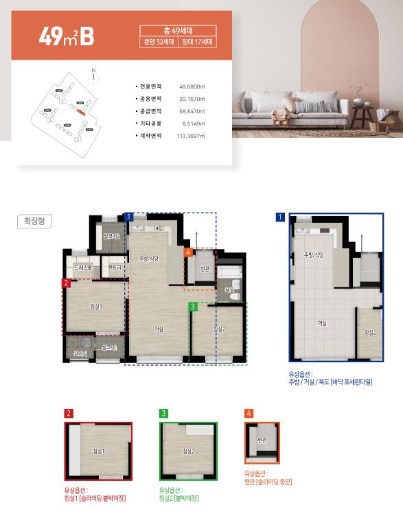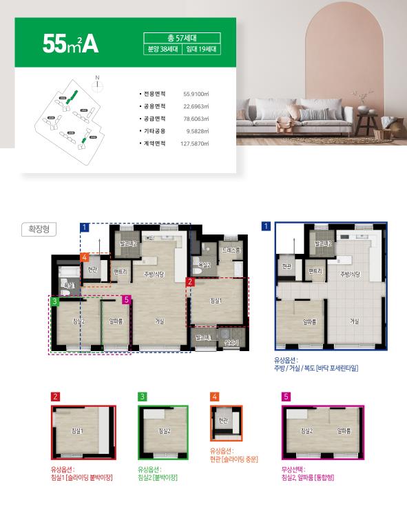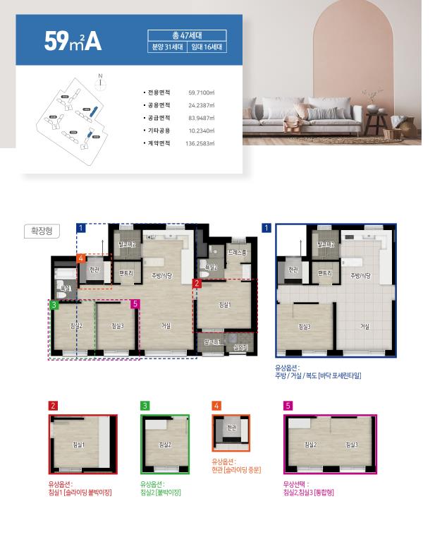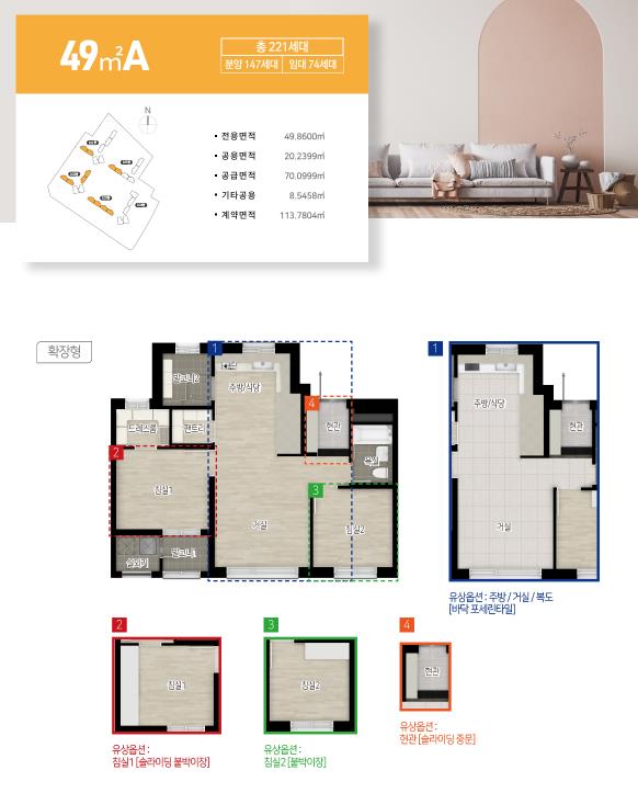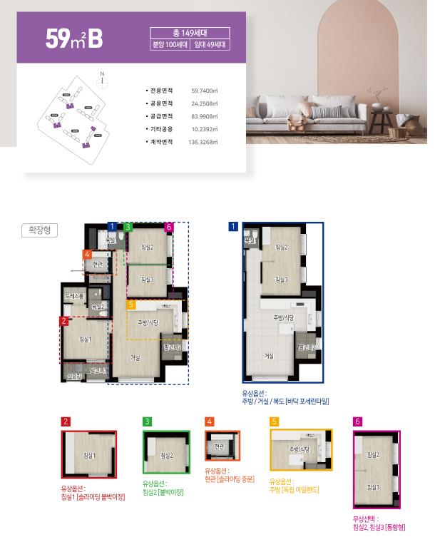 - 전용면적 49㎡A 147세대,499㎡B 32세대, 55㎡A 38세대, 59㎡A 31세대,59㎡B 100세대