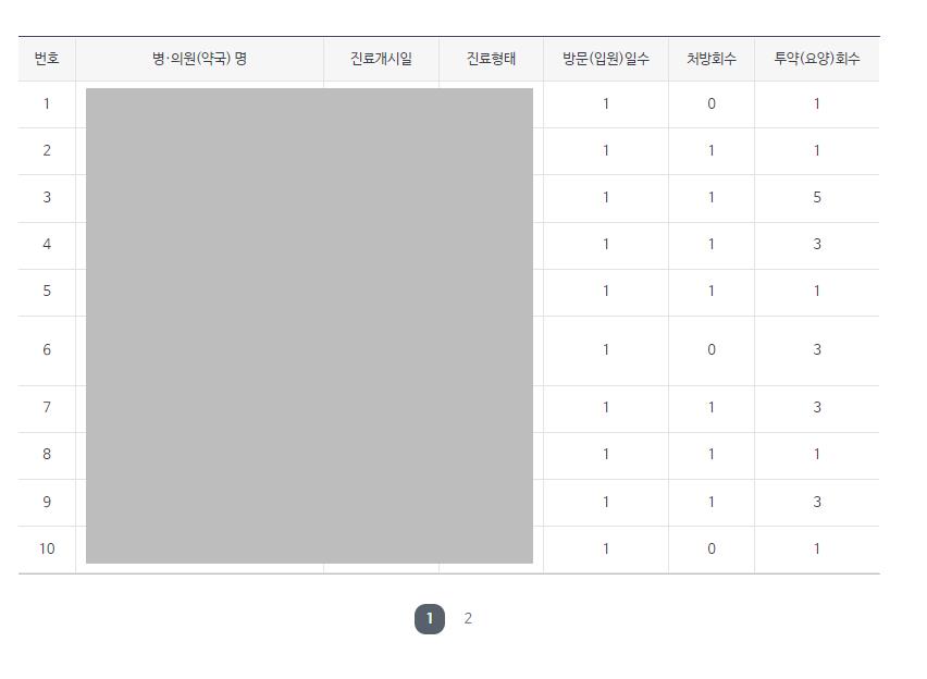 처방전 내용은 최근 1년간 방문한 내용만 나옵니다. 진료일자와 진료형태,처방횟수,투약일수등을 상세히 조회가 가능합니다.