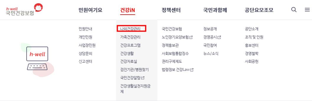 건강in메뉴에서 나의 건강관리를 클릭합니다.