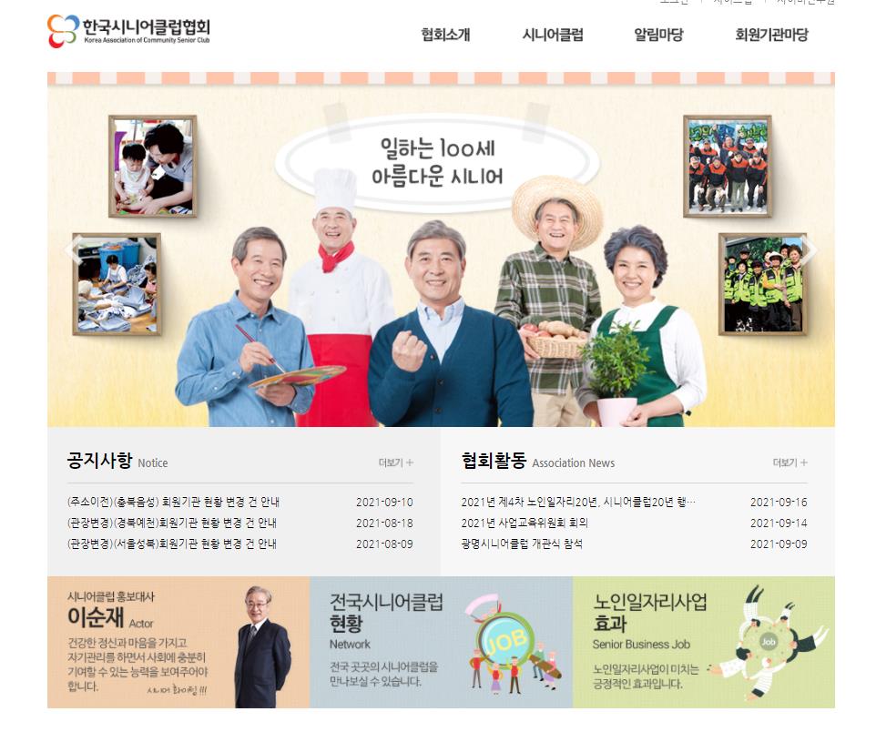 이렇게 내가 속한 지역의 홈페이지를 클릭하면 위처럼 지역 시니어클럽 홈페이지가 뜹니다.