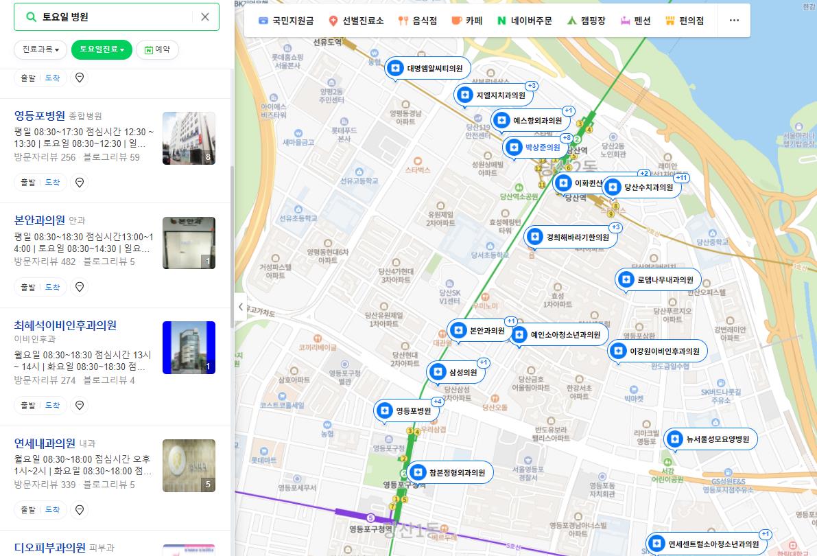 아니면 설치해둔 네이버지도 어플에 '토요일 병원'을 검색하면 내 주변에 토요일에 영업하는 병원 시간등을 확인할수 있습니다.