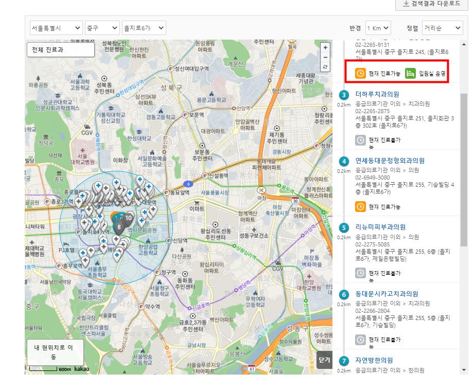 병원,약국을 클릭해 내가 사는 주변지역을 검색하면 주변에 '현재 진료가능'이라고 표시가 됩니다. 진료가 가능한곳에 방문전 전화해 문을 열었는지 확인후 방문하는것도 좋습니다.
