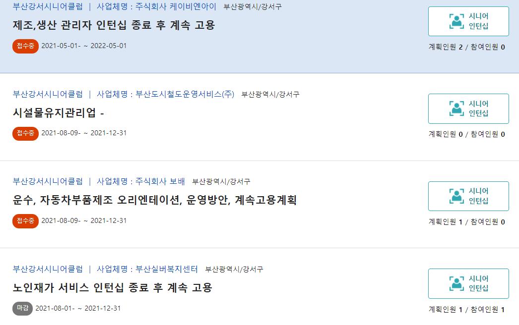 내가 사는 지역을 검색하면 그 지역의 시니어인턴쉽,공공근로등 다양한 근로 형태의 모집공고를 볼수 있습니다.
