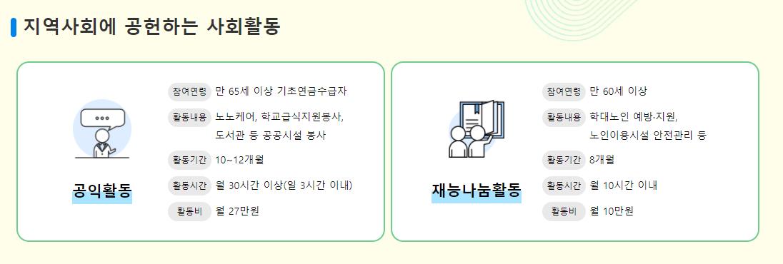 공익활동은 주로 만 65세 이상 기초연금수급자가 참여가능하며 노노케어,학교급식자원봉사,도서관 등 공공시설에서 봉사하며 주로 10~12개월 월 30시간 이상 일할수 있습니다.