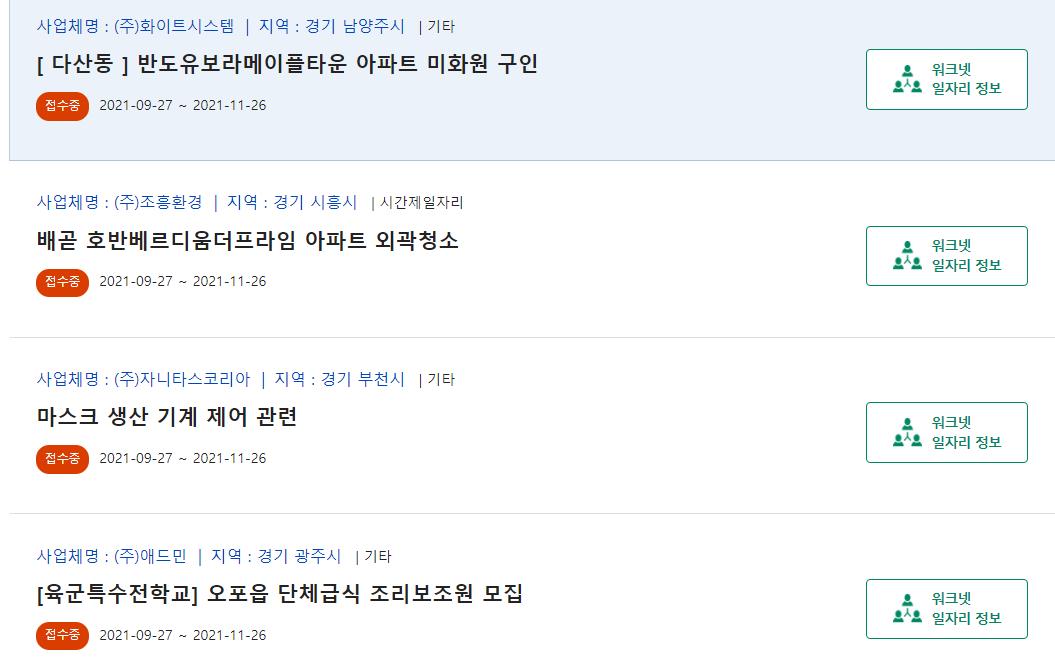 주로 아파트 미화원이나 경비원 구인구직 자리를 많이 볼수 있습니다.