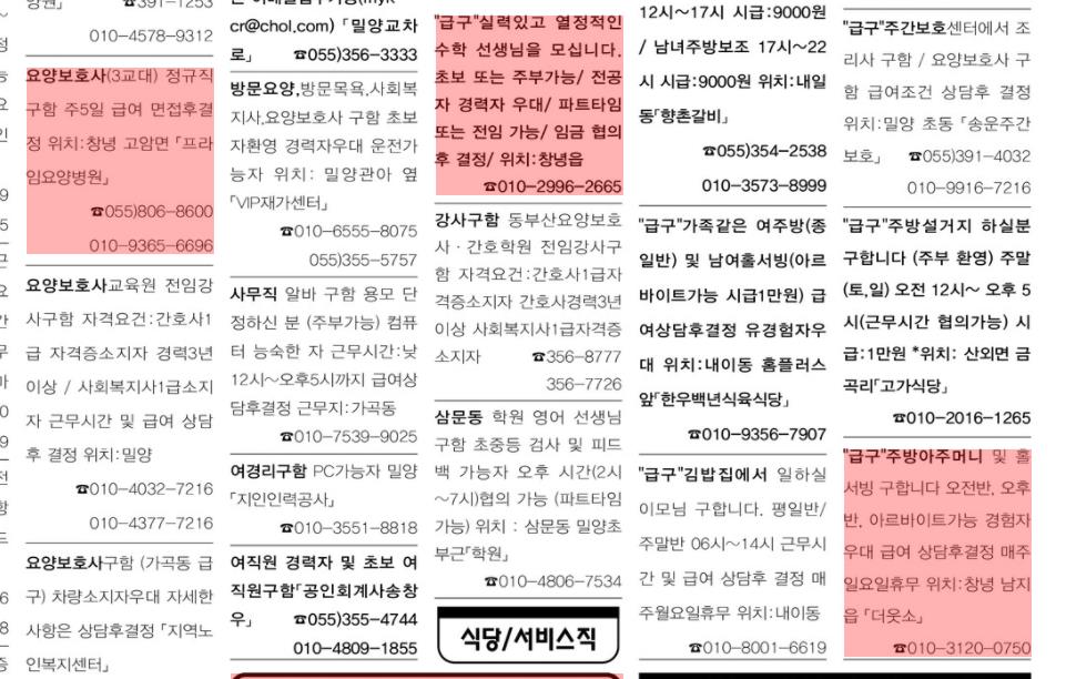 구인구직 칸으로 가면 이렇게 창녕과 관련된 정보는 붉은색 하이라이트로 되어 있어 창녕 구인구직과 관련된 정보를 쉽게 찾아볼수 있습니다.