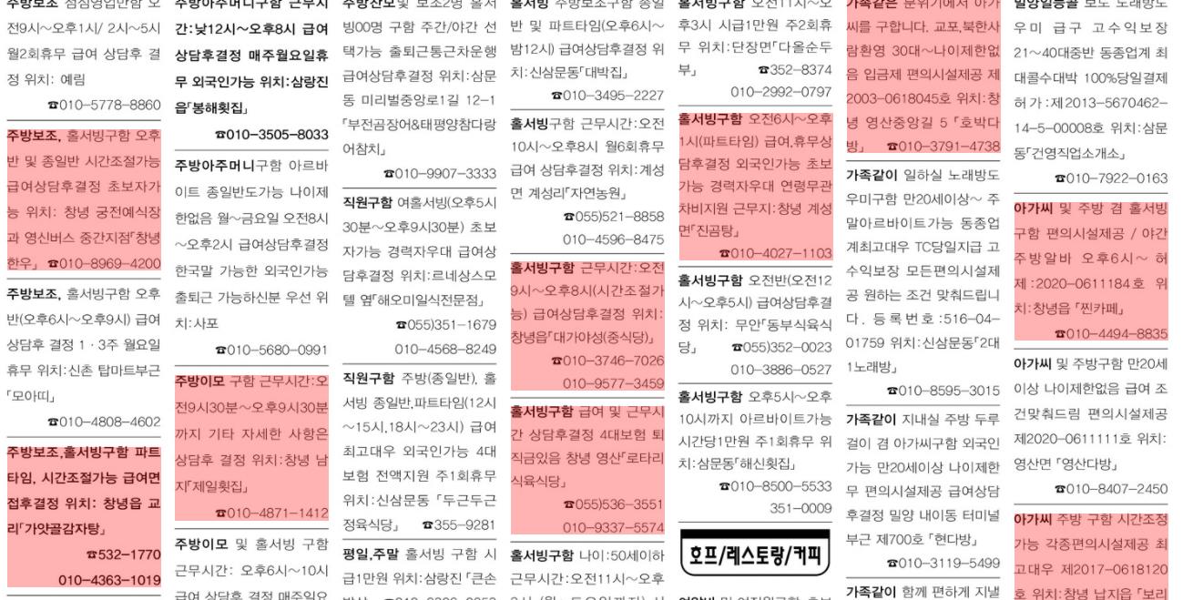 요양보호사,주방아주머니,주방보조,홀서빙등 많은 구인구직 광고가 보입니다.