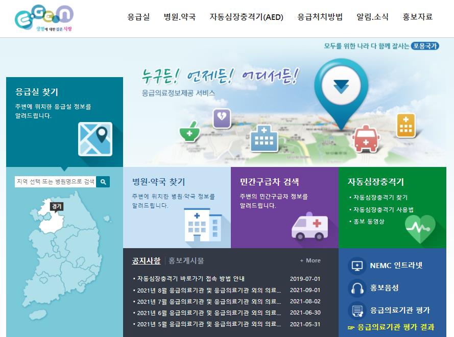 스마트폰이나 집 컴퓨터 PC에 인터넷이 연결된다면 응급의료포털(e-gen.or.kr)이나 보건복지부(mohw.go.kr)에서도 확인할수 있습니다.