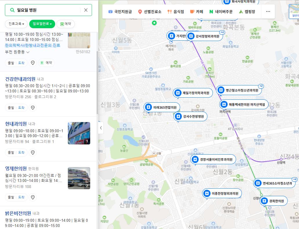 좀더 편리한 방법은 네이버 지도 어플에서 '일요일 병원'을 검색하면 주변에 일요일에 영업하는 병원 시간을 확인할수 있습니다.