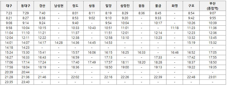 동대구역과 부산역에서 출발해 옥천역을 거쳐 대전역,신탄진역,부강역,조치원역,천안,성환,평택,서정리,오산,수원,안양역,영등포역을 거쳐 종점인 서울역에 도착하는 경부선 상행 시간표입니다.