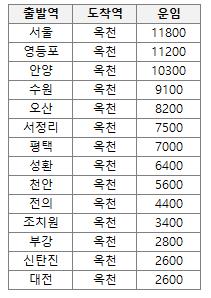 옥천역에서 출발하는 무궁화호의 역별 열차 운인요금입니다.