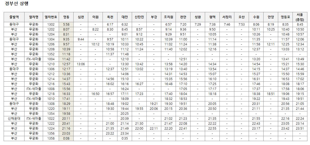 영동역 경부선 상행 무궁화호와 새마을호 열차 시간표입니다.