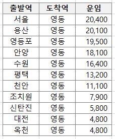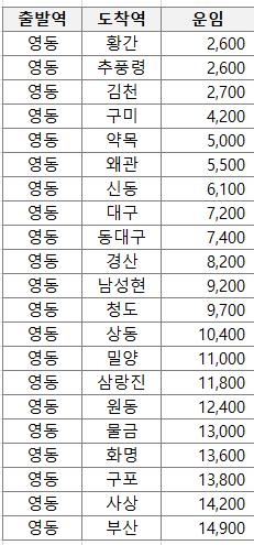 영동역에서 출발하거나 도착하는 새마을호 운임요금표입니다.