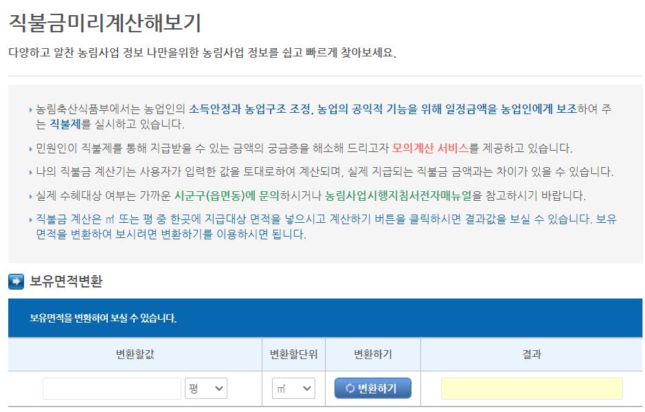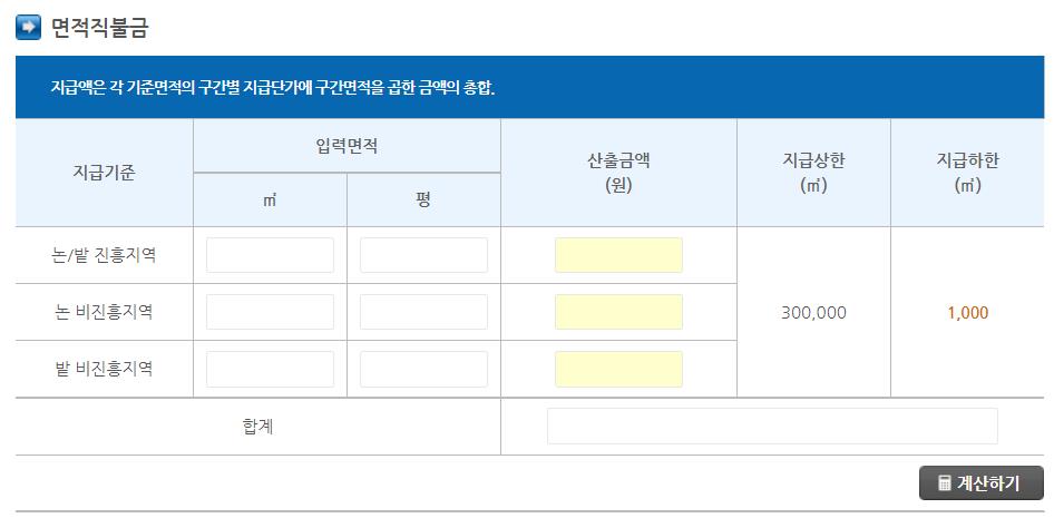 직불금은 m2이나 평 중 한곳에 지급대상 면적을 넣고 계산하기 버튼을 계산할수 있습니다.