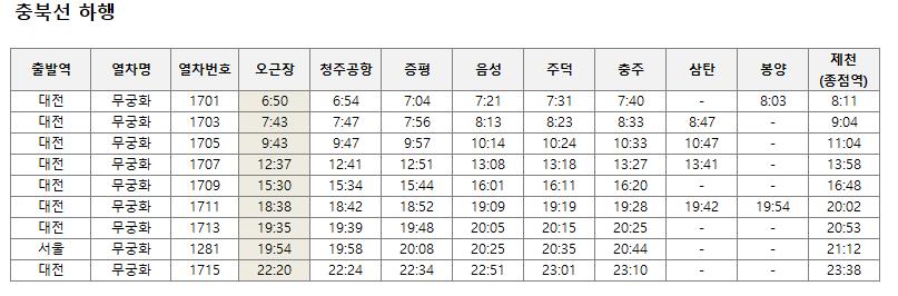 대전역과 서울역을 출발하여 오근장역에서 청주공항역,증평역-음성역-주덕역-충주역-삼탄역-봉양역을 거쳐 종점역인 제천역까지 가는 노선입니다.