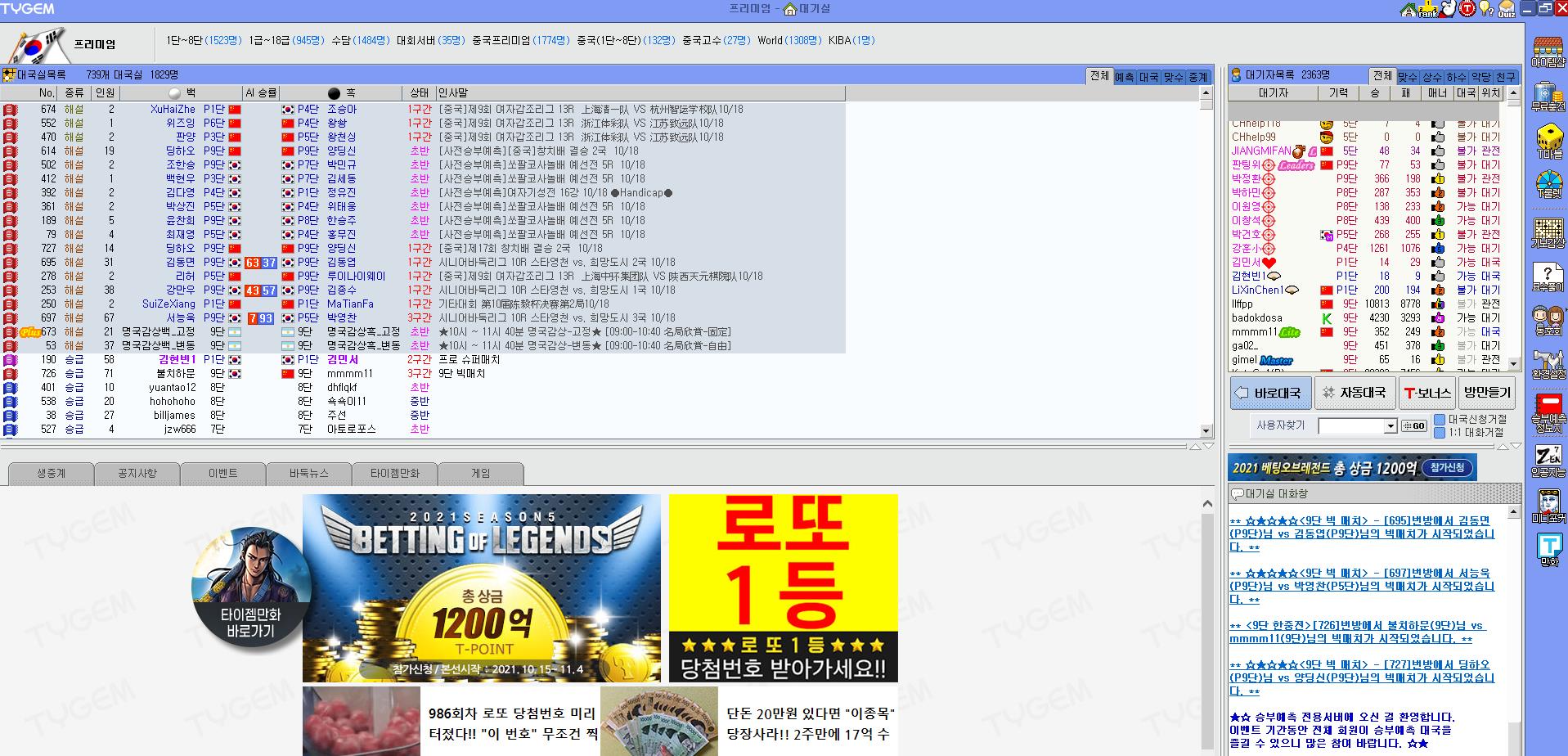 상단에는 현재 프로들의 대국을 실시간으로 볼수도 있습니다.