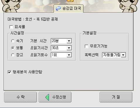 대국상대와 대국방법과 시간설정,기본설정,형세분석등을 설정하여 대국을 시작했습니다.