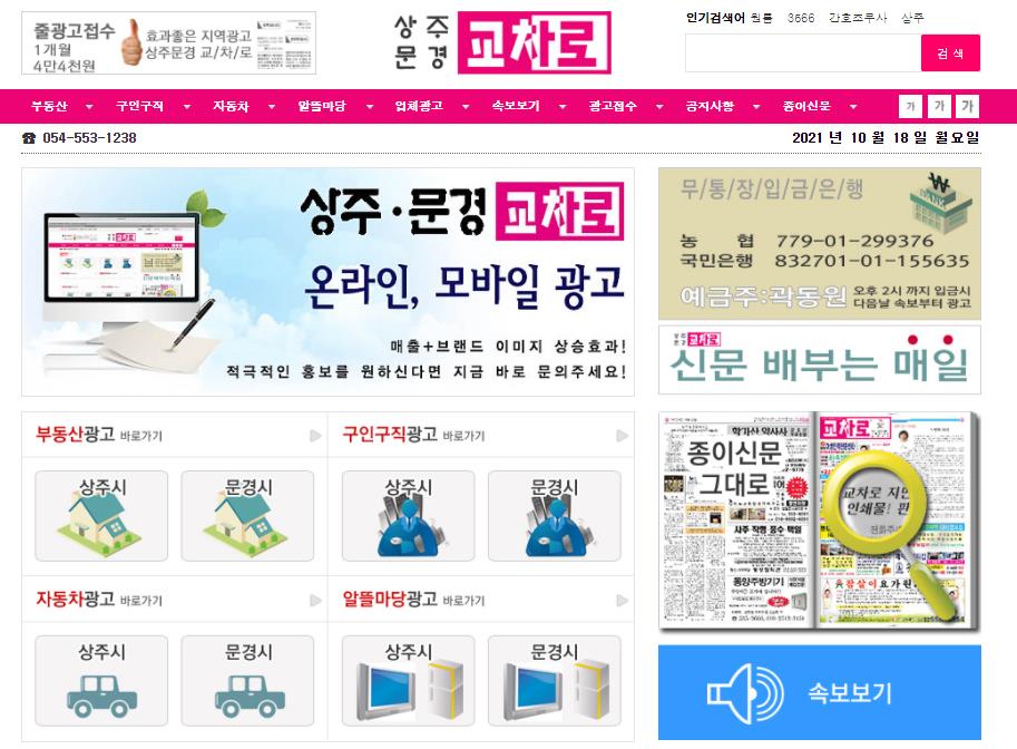 상주문경교차로 홈페이지에서는 부동산,구인구직,자동차,알뜰마당 처럼 지역에서 구할수 있는 정보들을 개제하거나 찾아볼수 있습니다.