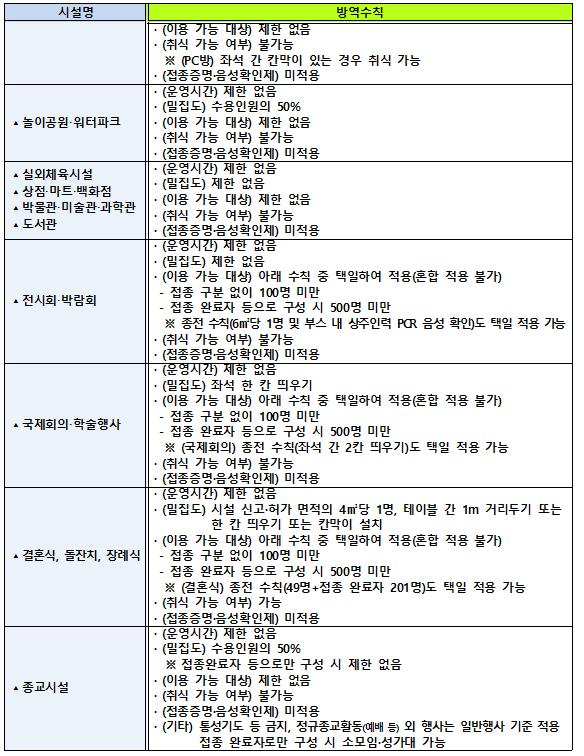 | 위험도 높은시설 | 유흥시설 등 | 접종증명,음성확인제 도입 | 24시 까지 | 시간제한 없음 | |