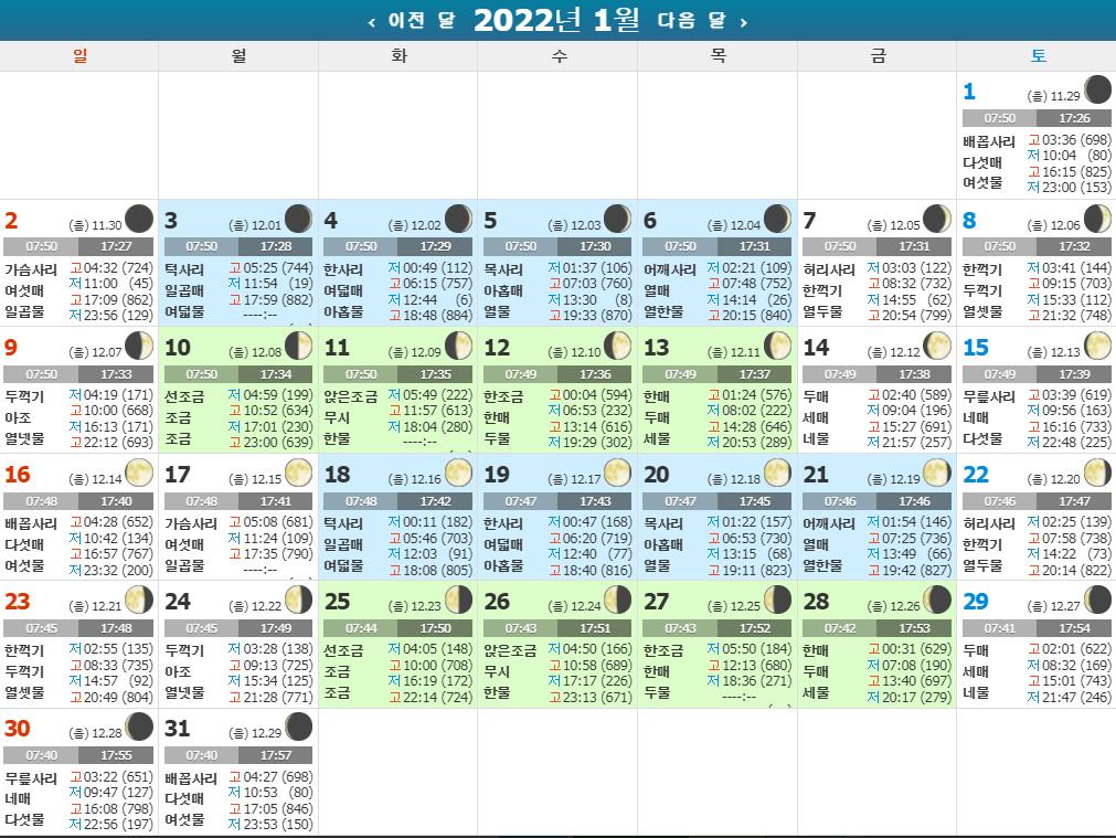 1월 21일,22일,23일,24일 물때 시간을 확인할수 있습니다.