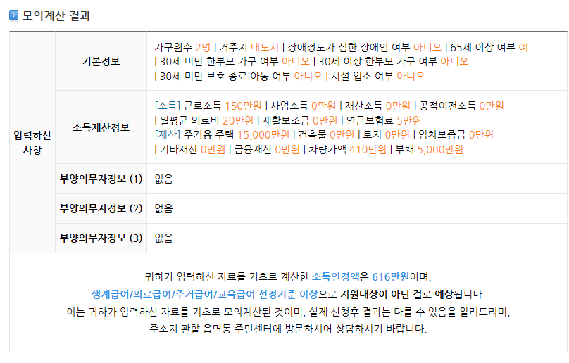 모의계산 결과가 자세히 나와서 제가 임의로 넣은 숫자로 소득인정액은 616만원으로, 지원대상자가 아니라고 뜹니다.