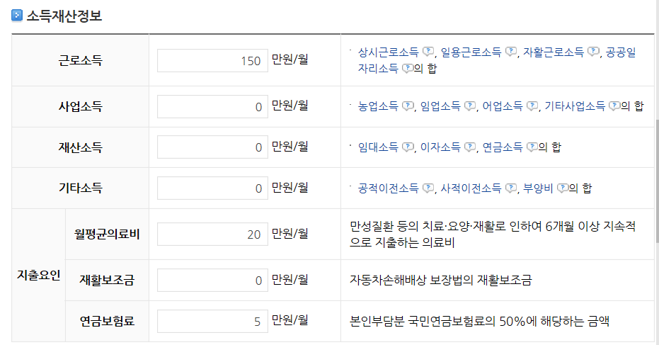 모의계산을 해보았는데요. 가구원수,거주지,연령,장애여부,소득재산정보 등 상세히 관련 정보를 적어봅니다.
