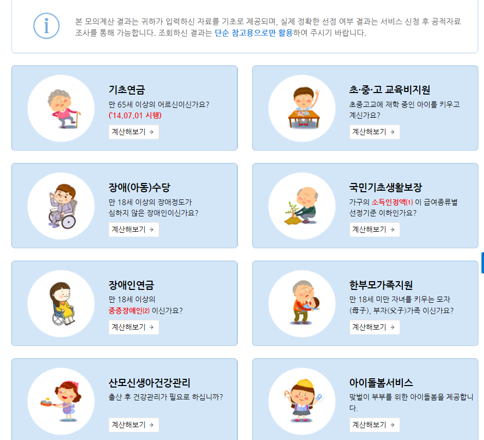 기초연금 대상자인지,장애,아동수당,장애인연금,산모신생아건강관리,초중고 교육비 지원,국민기초생활보장,한부모가족지원,아이돌봄서비스 해당자인지 모의 계산 해 볼수 있습니다.