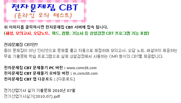 위 이미지를 클릭하시면 전자문제집 CBT 서버에 접속 됩니다. (해설, 모의고사, 오답노트, 워드, 컴활, 기능사 등 상설검정 CBT 프로그램 기능 포함) 전자문제집 CBT란? 종이 문제집이 아닌 인터넷으