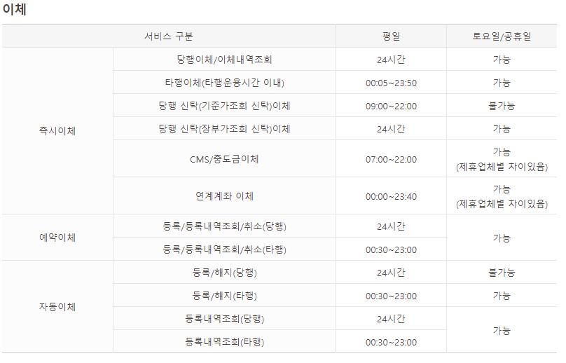11 | 각종예금 이체 | 24시간(연중무휴) - 투자신탁(MMF) : 평일 09:00 ~ 22:00 |
