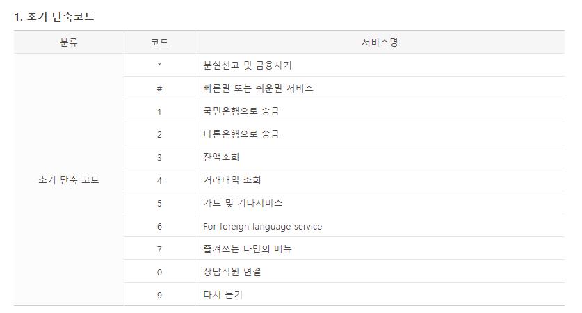 | 초기 단축 코드 | * | 분실신고 및 금융사기 |