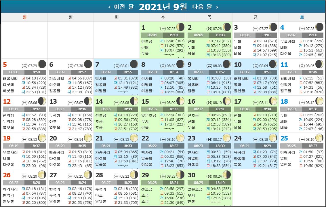 추석이 있는 9월 18일,19일,20일,21일,22일 물때시간표입니다.