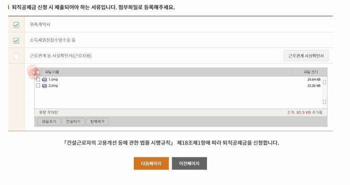 다음페이지로 넘어가면 퇴직공제금 신청시 제출되어야하는 서류들이 나오며 관련서류를 첨부합니다.