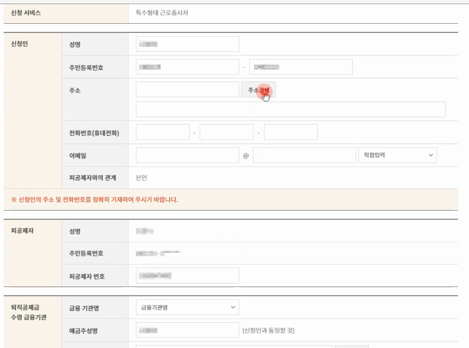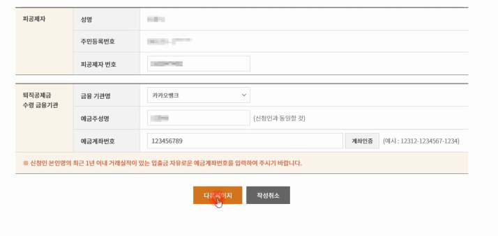수령받을 계좌 번호까지 작성후 다음페이지 버튼을 클릭합니다.