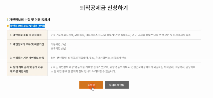 퇴직공제금 신청하기를 클릭하면 먼저 개인정보의 수집 및 이용동의서를 확인 후 동의합니다.