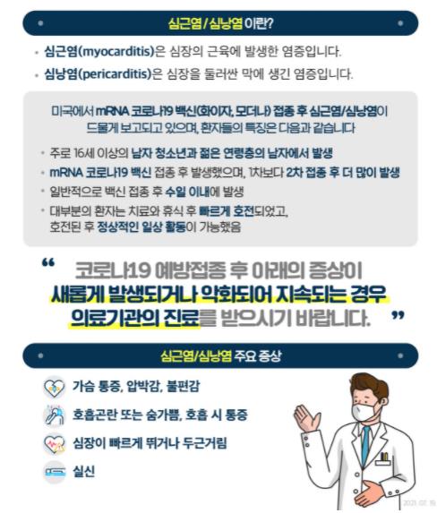 위의 심근영 증상이 느껴질경우 신속히 의료기관으 진료를 받으며 해당환자를 진료한 의료기관은 이상반응을 즉시 신고하도록 하고 있습니다.