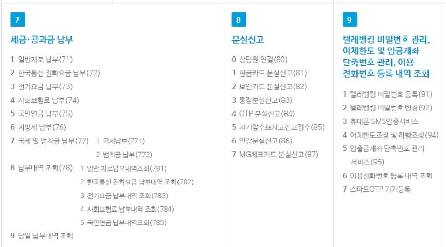 | 7.세금,공과급납부 | 8.분실신고 | 9.텔레뱅킹 비밀번호관리,이체한도 및 입금계좌 단축번호 관리,이용전화번호 등록내역 조회 |