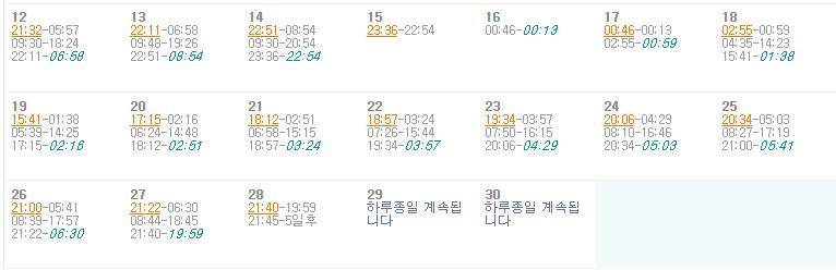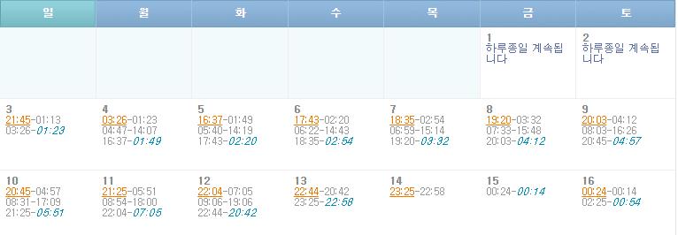 11일토요일에 표시되어있는 21:32~05:57 에서 파란색 표시는 다음날 새벽 5시 57분까지 바다갈라짐이 있다는 의미 입니다.