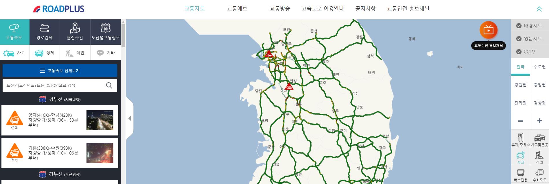 고속도로 cctv도 실시간으로 볼수 있어서 경유지의 교통상황을 실시간으로 볼수 있습니다.