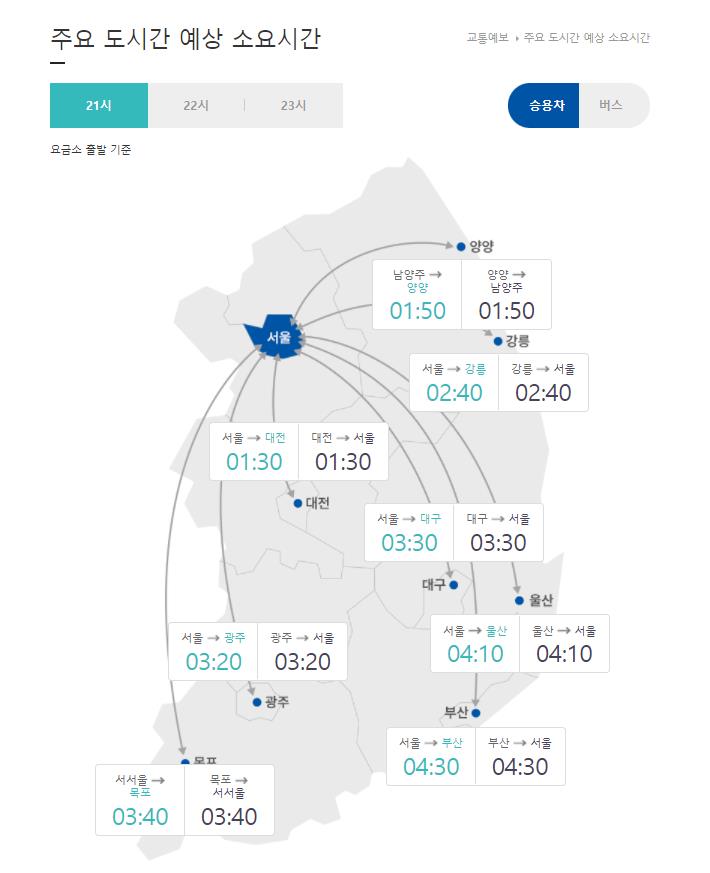 주요 도시간 예상소요시간을 확인할수 있습니다.