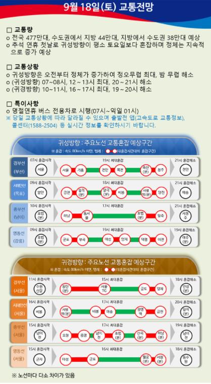 9월 18일 토요일, 9월 19일 일요일,20일 월요일,21일 화요일,22일 수요일의 교통전망을 확인할수있습니다.